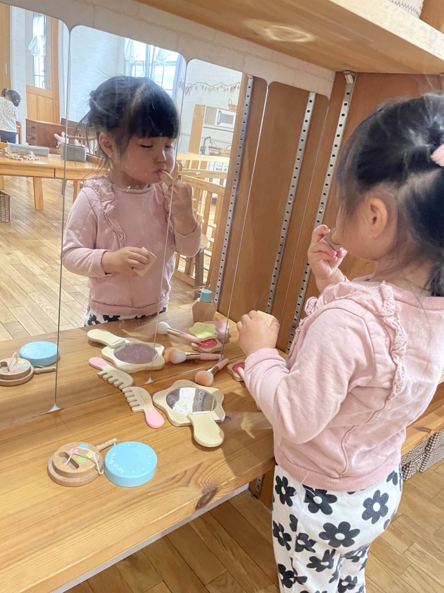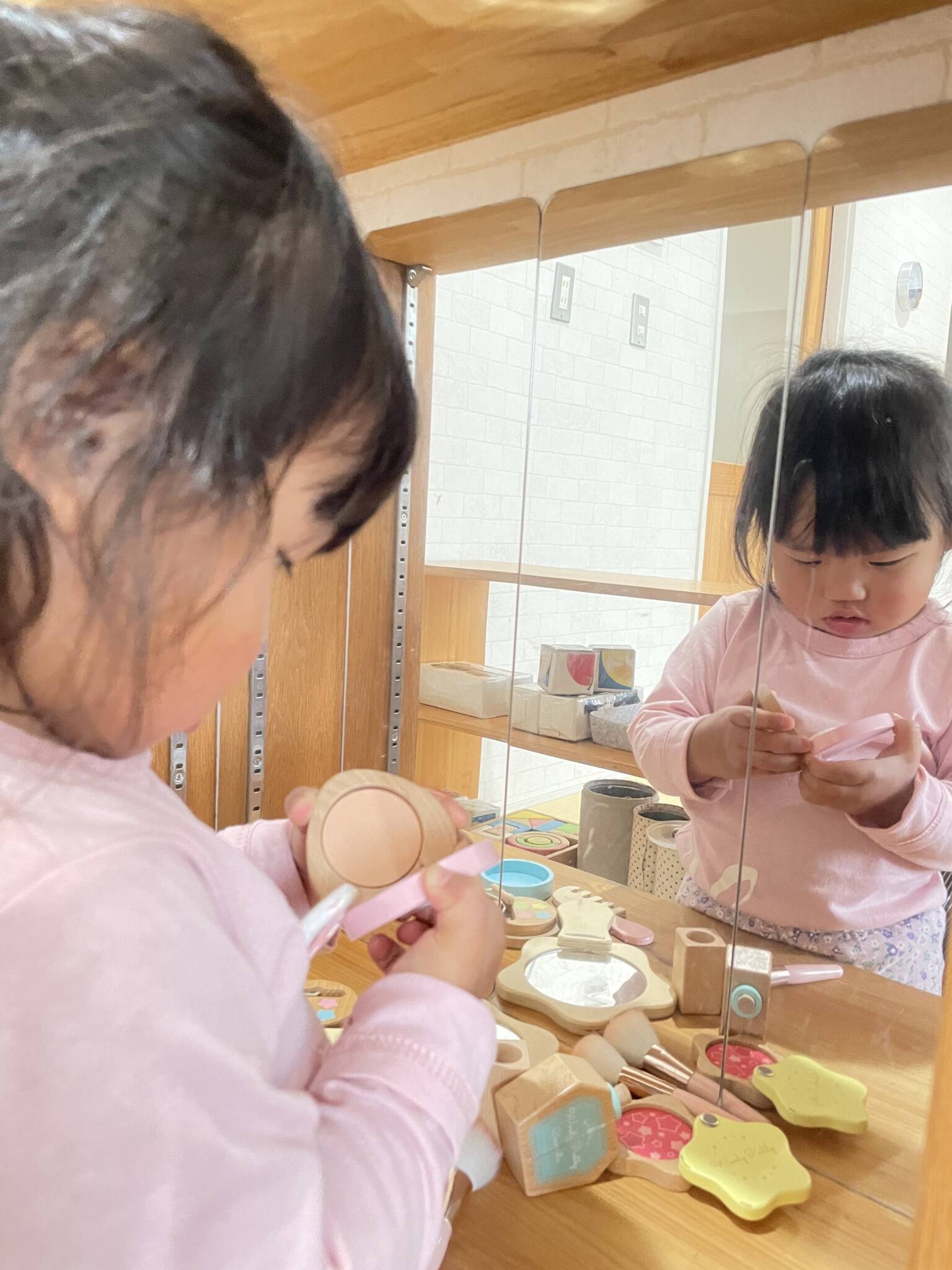 お母さんのお化粧している様子を見てますね💕
